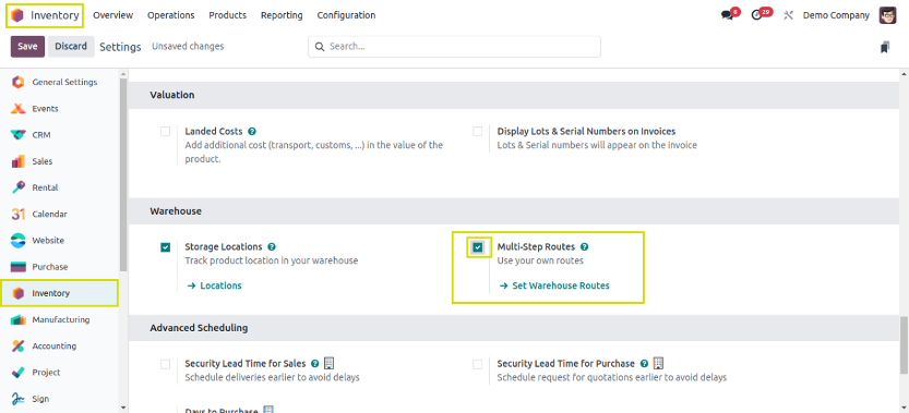 - Navigate to the Inventory module and check that the Multi-Step Routes option is enabled.